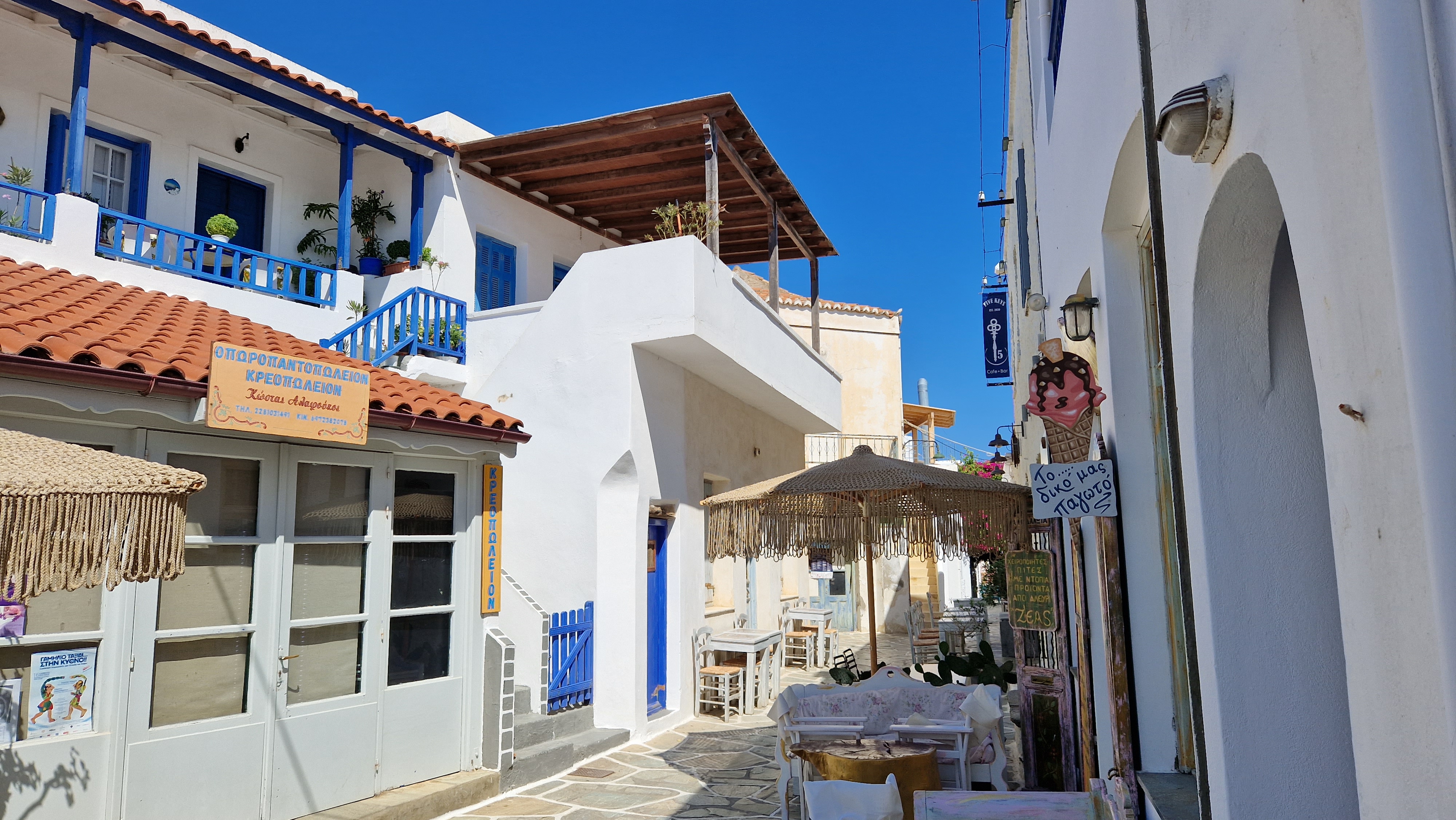 On en a profité pour prendre le bus local pour rejoindre la Chora, le village principale de l’île à 5 Km. C’était très sympa de se balader dans ces petites ruelles très typiques des Cyclades. Cette île n’est pas très touristiques. On y rencontre surtout des Grecs qui sont tous forts sympatiques. Elle est connue pour ses nombreuses plages, ses sources chaudes et ses innombrables églises : il y en a 359 pour une superficie de 99 km2 !